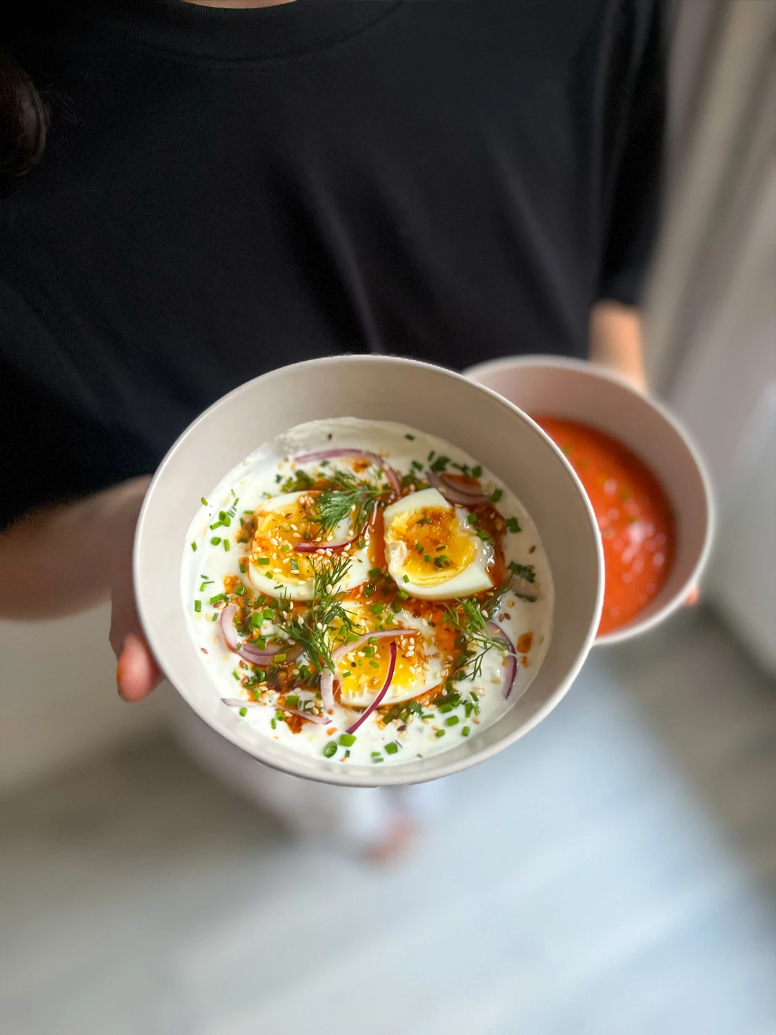 Passer ensuite au montage du turkish egg. Sur le lit de yaourt grec, déposer l'oeuf mollet coupé en deux, les herbes, l'oignon rouge tranché, un joli filet d'huile piquante à l'ail, des graines de sésame et un généreux tour de poivre de Sichuan.